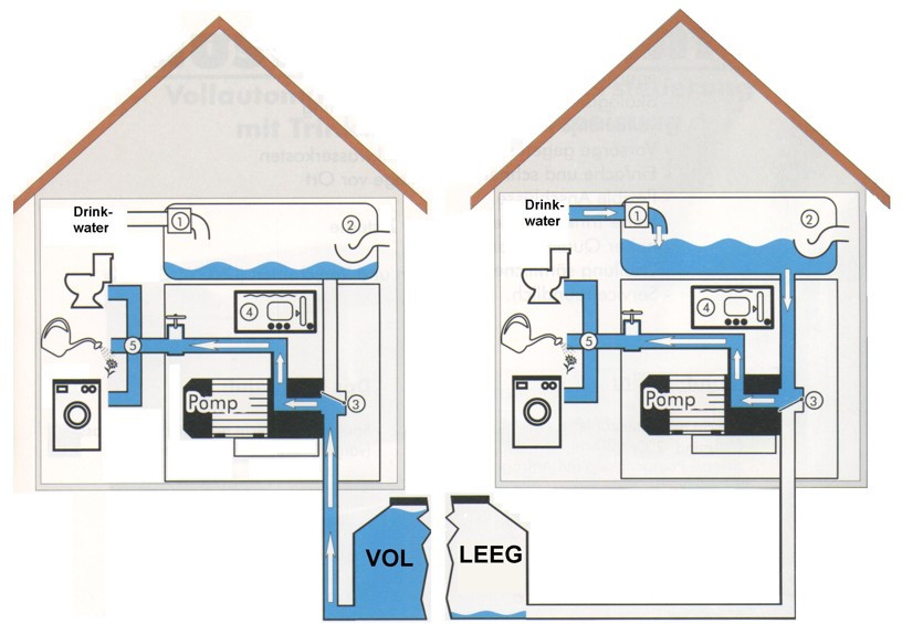 - De centrifugaalpomp wordt vanuit de regenwatertank ondersteund met een laadpomp voor een bedrijfszekere aanvoer van regenwater