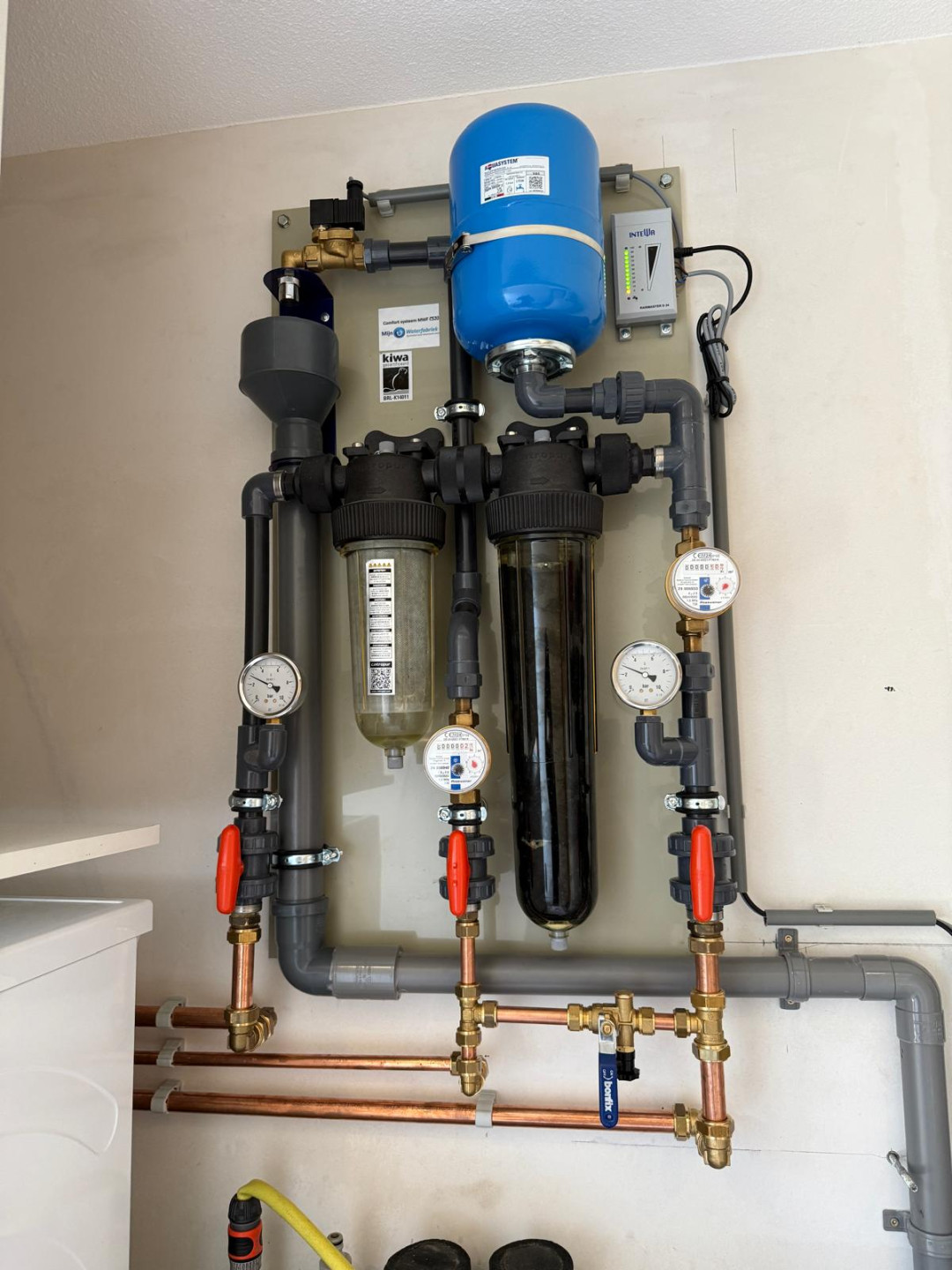 Het Comfort systeem is in de woning gemonteerd. Deze zorgt voor extra filtering van het regenwater en voor back-up van leidingwater in zeer droge periodes. En de bewoners kunnen op de watermeters aflezen hoeveel drinkwater ze bespaard hebben.